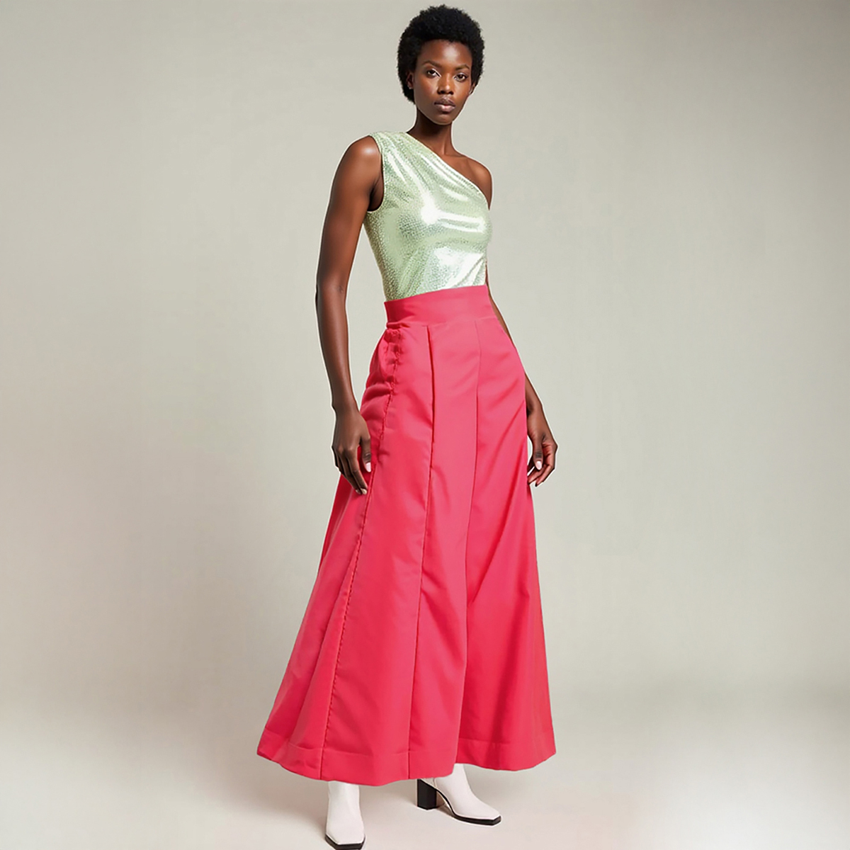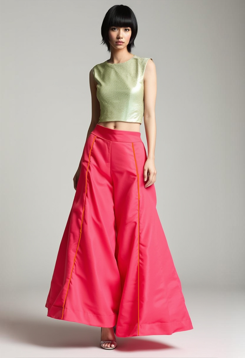 Poderosa, gráfica e escultural. Esta calça pantalona em tactel rosa chiclete foi criada para mulheres que desejam marcar território com leveza e impacto visual.