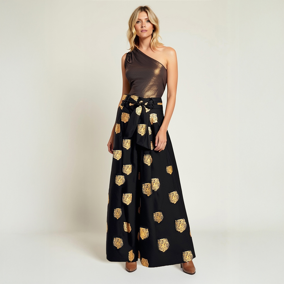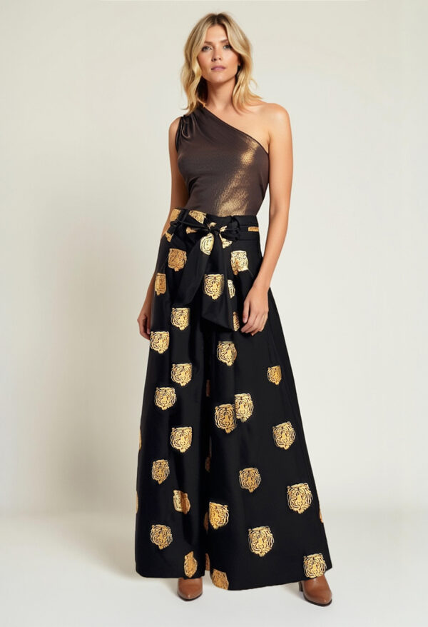 A Calça Pantalona Tigre Dourado é uma peça imponente e cheia de personalidade. Feita em tecido algodão, leve com ótimo caimento, ela traz em bordados de tigres dourados a simbolização da força e presença. O cós alto com amarração valoriza a cintura e garante conforto, enquanto o corte amplo alonga a silhueta com elegância. Ideal para compor looks sofisticados e autênticos, do dia à noite.