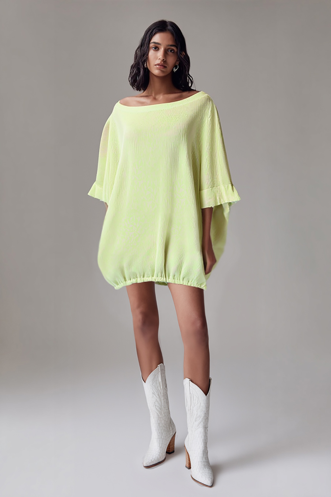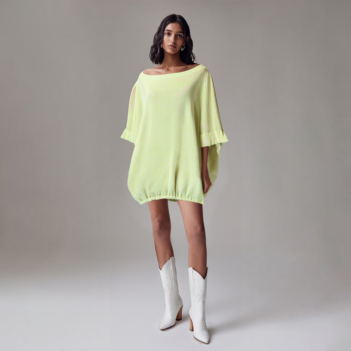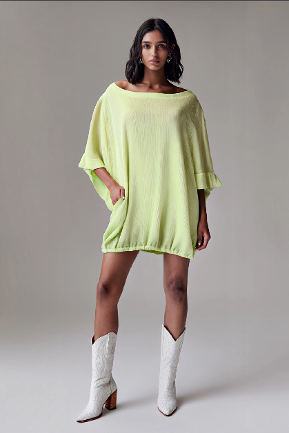 Este modelo em tecido tecnológico plissado oferece leveza e movimento, enquanto o caimento solto respeita a pluralidade dos corpos — sem impor, apenas abraçando. A gola ampla permite um toque de charme ao deixar um ombro à mostra, revelando com sutileza. Possui bolsos laterais funcionais, perfeitos para quem gosta de unir elegância e praticidade.